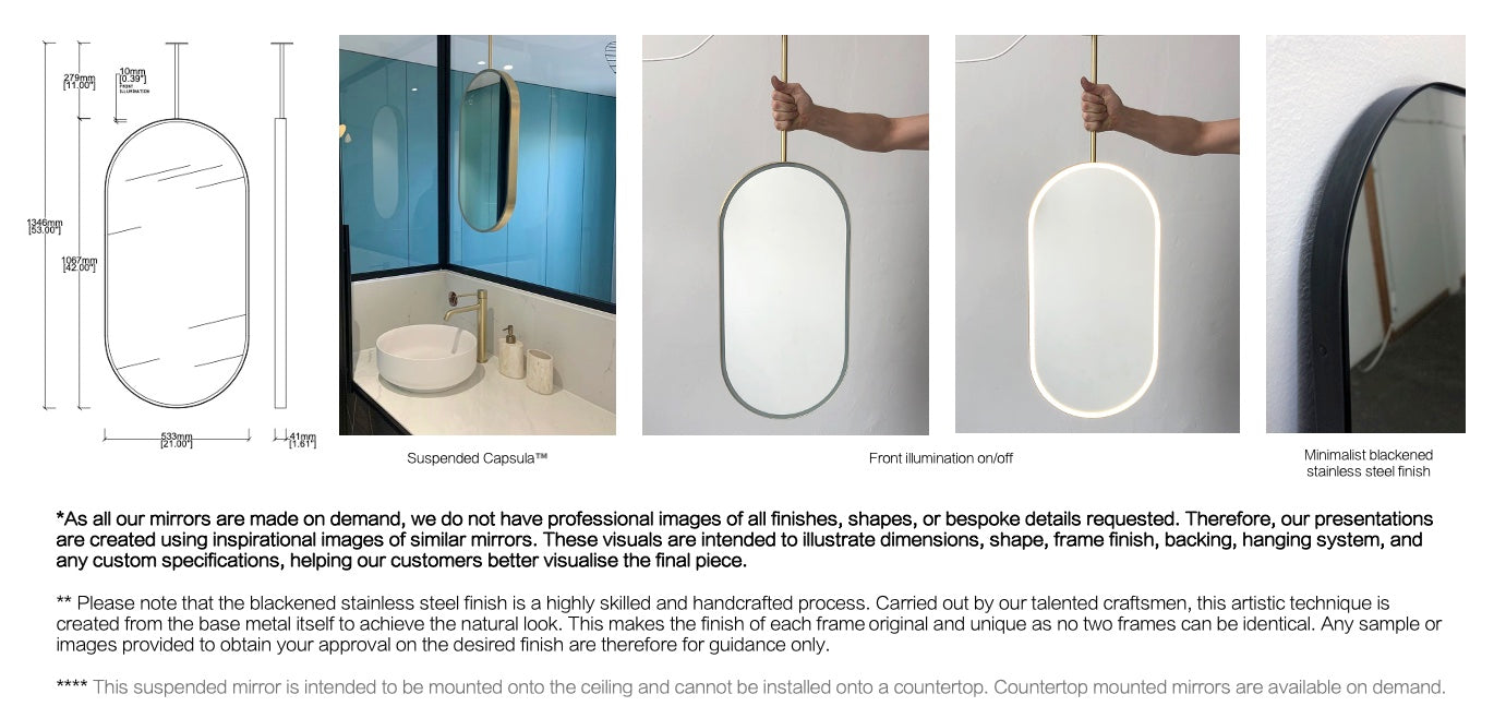 Set of 2 bespoke ceiling suspended Capsula™ mirror with Standard silver mirror tint and minimalist frame blackened stainless steel finish.